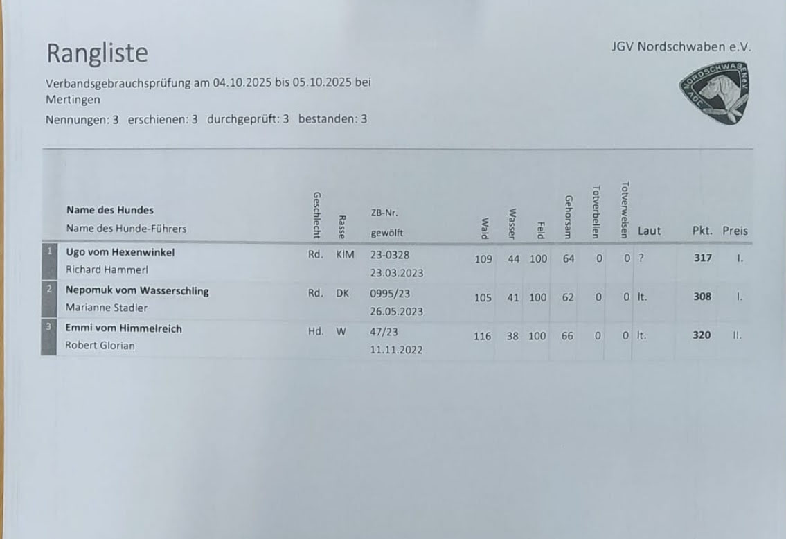 Wir bedanken uns bei den Richtern und den Revierinhabern für die erfolgreiche Ausrichtung der Prüfung.