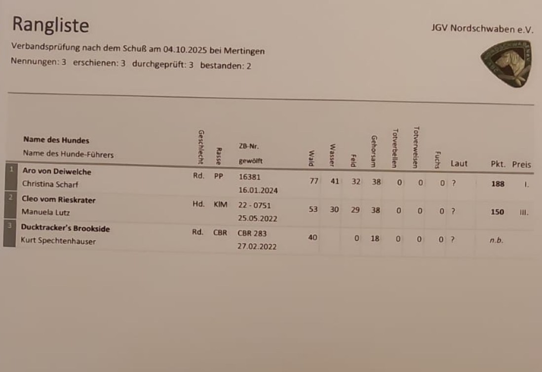 Suchensieger wurde mit 188 Punkten im I. Preis Aro von Deiwelche (PP) mit seiner Hundeführerin Christina Scharf. Waidmannsheil an alle Hundeführer !