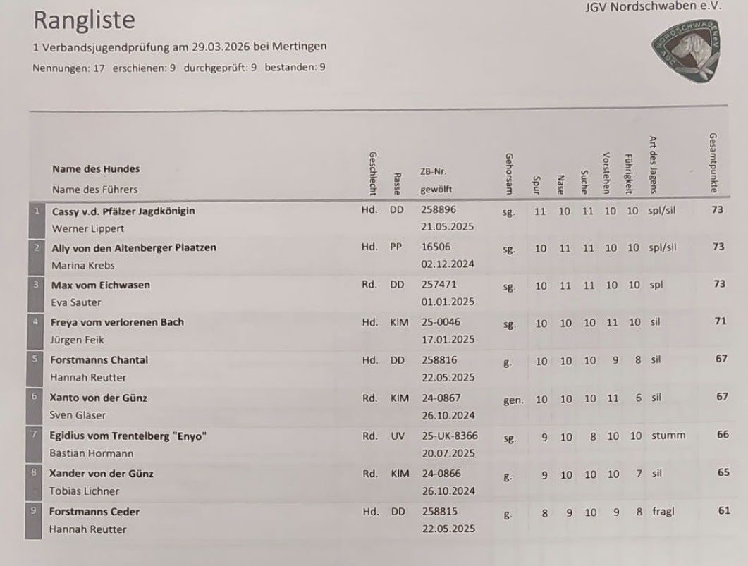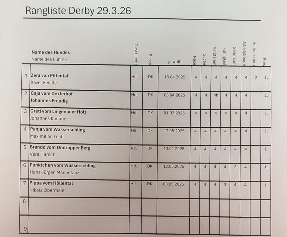 Die erste VJP-/Derby-Prüfung verlief erfolgreich und bot den teilnehmenden Gespannen eine hervorragende Gelegenheit, die Anlagen der jungen Jagdhunde unter Beweis zu stellen. Alle Teilnehmer zeigten engagierte Leistungen und trugen zu einem fairen und kameradschaftlichen Prüfungsablauf bei. Herzlichen Glückwunsch und Waidmannsheil an alle erfolgreichen Gespanne sowie an die Suchensieger Werner Lippert mit seiner Hündin Cassy v.d. Pfälzer Jagdkönigin (VJP) und Xaver Feistle mit seiner Hündin Zera von Pittental (Derby) zu dieser besonderen Leistung.